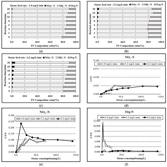 Figure 4. Effect of ozone feed rates on (a) NO2-N, (b) NO3N, and (c) Org-N, and ozone consumption vs. generated (d) NO2-N, (e) NO3N, and (f) Org-N.