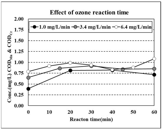 The chemical oxygen demand potassium dichromate index (CODCr) measures the oxygen equivalent of the amount of organic matter oxidizable by potassium dichromate in a 50% sulfuric acid solution. The chemical oxygen demand potassium permanganate index (CODMn) measurement of a sample is an alternative method for measuring the oxygen requirement and is an indication of the oxidative degradation potential of wastewater [2]. The CODMn measurement requires a shorter oxidation time, simpler apparatus, and produces no hazardous chromium waste. Due to its high reproduction potential and reactivity, ozone reacts with both organic and inorganic compounds [22,23,24]. In addition, ozone is a strong oxidant that is capable of causing cell lysis and disinfection and increasing the content of soluble COD [17,25,26,27].
