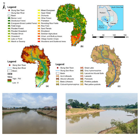 Sen River Basin (a) Digital Elevation Model (DEM), which is the largest tributary of Tonle Sap Lake Basin, (b) Land use distribution, and (c) Soil type distribution and field photo of streamflow analyzed location at Stung Sen Town at the outlet of the Sen Basin.