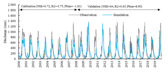 The mean annual rainfall was 1535 mm; 54% (827 mm) of the average annual rainfall was withdrawn by actual evapotranspiration, 36% (558 mm) became the streamflow, and another 10% for deep groundwater recharge from 2000 to 2019. The annual water yield of 558 mm comes from surface runoff (proportion of 43%), lateral flow (proportion of 25%), and groundwater (proportion of 32%). The calibration period covers 2000–2008 at daily step, while the validation period covers 2009–2019 (Figure 2). Based on the RAPS, both observed and simulated flow showed a similar trend and an agreement in a decrease in flow between 2000 and 2019. The statistical performance of the daily streamflow simulation suggested that the SWAT model was well-calibrated/validated and is in a satisfactory and good range in the Sen River Basin (Table 4). Although the calibration and validation data are not separated, the graphical results show good performance for the calibration period and satisfactory performance for the validation period. The model produced the streamflow in an acceptable range at the start and end of the seasonal streamflow. However, certain peak-flow estimations were somewhat off. The overall model performance reasonably mirrored the observed flows for an independent dataset. The set-up SWAT model demonstrates enough potential to further process the procedure of climate change effect assessment within this range of daily streamflow performance.
