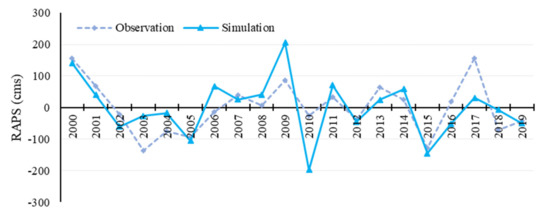 Time series of observed and simulated daily streamflow (above); and time series of RAPS of observation and simulation (below).
