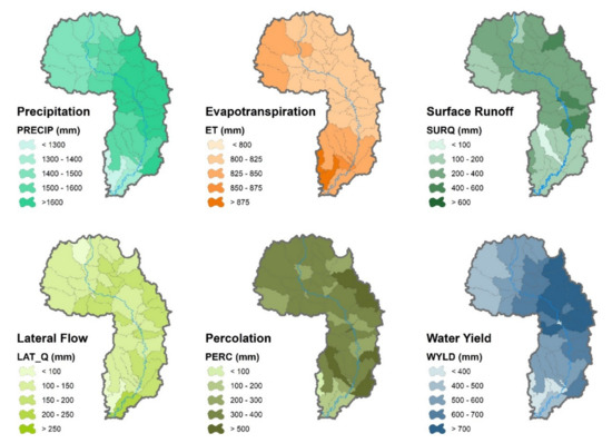 It was necessary to assess the baseline water balance and components to comprehend the detailed information in the Sen River Basin. It is ideal for analyzing and quantifying various hydrological components in the study area to address water management issues. In addition to the daily streamflow, the SWAT model calculated pertinent water balance components. Water balance components, including precipitation, evapotranspiration, lateral flow, surface runoff, and water yield of the baseline period from 2000 to 2019, were incorporated into the validated model output as hydrological components (Figure 3). This resulted in intra-annual hydrological component variation (Table 5). The monthly contribution of water balance components is high in July, August, and October during the wet season and contributes low values from January to April. Actual evapotranspiration (AET) caused the most water loss from the basin among these components.