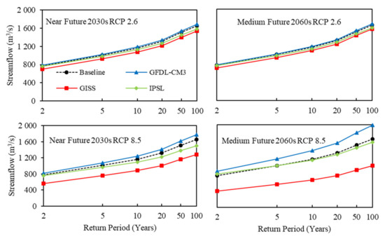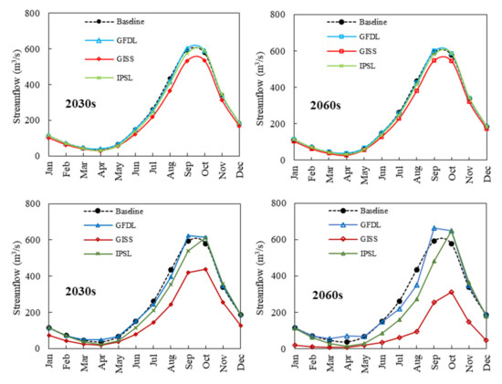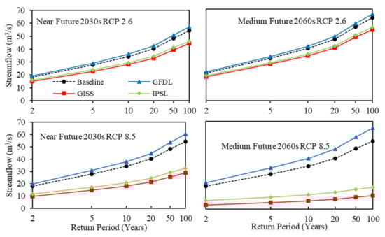 For the Q95 in the 2030s, streamflow is predicted to increase by 2% and 7% by the GFDL model and, in the same period, to decrease from 15−42% and 11−32% by the other two models for RCP2.6 and RCP8.5, respectively. In the 2060s, Q95 is expected to increase and decrease in a higher magnitude than in the 2030s. It would increase by 0−11% for the GFDL model, but it would decrease from 11−82% and 8−57% through the GISS and IPSL models for RCP2.6 and RCP8.5, respectively. The significant decrease in Q95 projected by the GISS model indicated that the drought event would significantly increase in 2030s and 2060s.