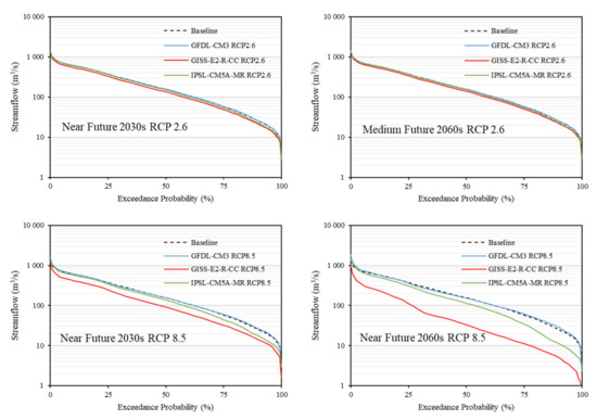 The flow duration curve was also evaluated by comparing the baseline and expected streamflow (Figure 5). This assessment aimed to test the absolute value of the streamflow for information to evaluate flow regimes as part of environmental flow prediction in ungauged watersheds or scenario analysis. Due to the low change in monthly flow, RCP2.6 produced a low change in flow duration. With this association with the monthly flow, RCP8.6 caused more alternated flow, particularly GISS and high flow.