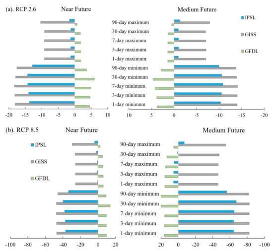 Design floods are typically estimated using maximum instantaneous flows [54,55]. Annual one-day maximum floods and instantaneous floods are positively associated [56]. As a result, the impact of CC on instantaneous flows is considered the same as the annual one-day maximum flow. This section focused on the minimums and maximums of streamflow on 1-day, 3-day, 7-day, 30-day, and 90-day. It is clear that all simulated flows reach the maximum and the minimum in the 1-day condition, and the highest percentage change is likely in the 90-day minimum condition, while the lowest percentage of flow change is in the 1-day maximum condition (Figure 6).