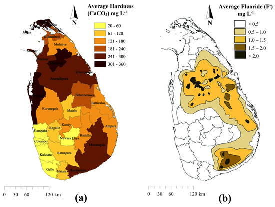 - Chandrajith, R.; Padmasiri, J.P.; Dissanayake, C.B.; Prematilaka, K.M. Spatial distribution of fluoride in groundwater of Sri Lanka. J. Natl. Sci. Found. Sri Lanka 2012, 40, 303. [Google Scholar] [CrossRef]