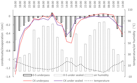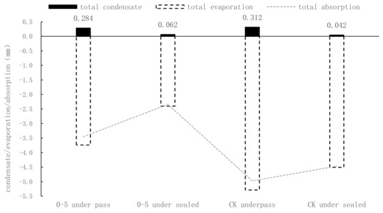 - The total amount of bi-directional condensation in the artificial water-retention layer was slightly less than that of the bare ground, while the total amount of unidirectional condensation in the artificial water-retention layer was significantly higher than that of the bare ground. Together, this data indicates that the artificial water-retention layer helped to promote the absorption capacity of water vapor in the near-surface air.