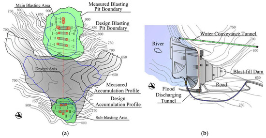 Rockfill dams have become one of the most preferred dam types for many projects because they are very adaptable and are convenient to construct. Rockfill dam heights now approach 300 m [1,2]. As one of the main types of rockfill dams, blast-fill dams have been widely studied and applied in Asian countries, such as China, the Soviet Union and Kyrgyzstan, because of the limited transportation requirements, short construction time and low investment required for such dams [3]. During the period of the Seventh Five-Year Plan, in-depth research on blast-fill dams was carried out as part of a key research project in China. At present, some blast-fill dam technologies in China have reached an advanced level, internationally [4]. In recent years, with the rapid improvement in economic strength and dam technology, blast-fill dams in hydraulic engineering have gradually entered operation and aging periods, while blast-fill dams are still in their infancy in tailings management, soil and water conservation, disaster prevention and mitigation, etc. In addition, with the emergence of new problems concerning landslides, confined lakes, abandoned slag dams, soft-rock dams, etc., the design, operation, management and safety of blast-fill dams again gained considerable attention from scholars [5,6].
