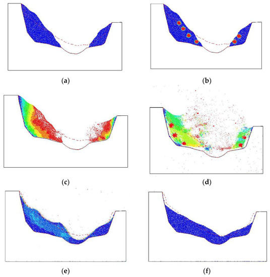 The whole blasting process simulated by the open-source DEM software Yade lasts 234.33 s and takes 32.4 h. The shape changes at the typical time are as follows. (1) After detonating the first set of explosion chambers, the blasting cavities are shown in Figure 3b. As shown in Figure 3c, the rock mass on the oblique upper side of the first blasting holes is broken and thrown into the air, forming a free face for the subsequent blasting. (2) After detonating the second set of explosion chambers, the rock mass in the blasting area is broken and thrown towards the riverbed, as shown in Figure 3d. (3) The equilibrium process after blasting is as shown in Figure 3e. The rocks thrown into the air gradually fall to the ground, and the unstable accumulations on both banks slide to the riverbed. (4) The final shape of blasting accumulation is shown in Figure 3f. The stacking line simulated by the DEM shows a good agreement with the field-measured results. Therefore, the discrete element simulation can accurately reflect the primary process and principle of blast-fill-dam construction, laying a foundation for the structural characteristic analysis of the blast-fill dam.