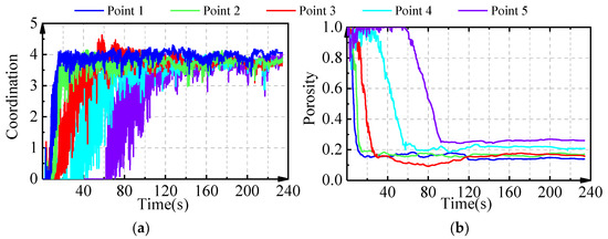 Compaction change of accumulation after blasting: (a) coordination; (b) porosity.