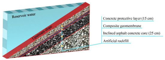 Due to water storage, the asphalt concrete had been damaged several times, causing seepage. Subsequently, the crack and collapse pits in the IACC were repaired and reinforced. The main engineering measures include the following: (1) Strengthening the IACC foundation. To improve the foundation density of the inclined core, the IACC foundation was filled with grout. (2) A composite geomembrane was laid on the IACC to strengthen the seepage control effect in the dam body. (3) At the interface between the upstream face and dam abutment, an expansion joint is set to prevent the dam body from being pulled and cracked. The seepage control measures for the dam body after reinforcement are shown in Figure 5.