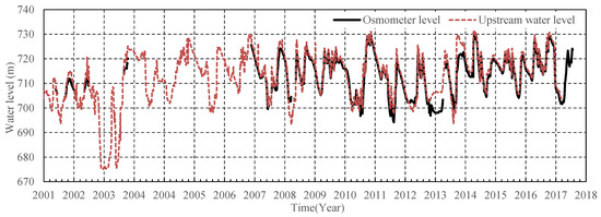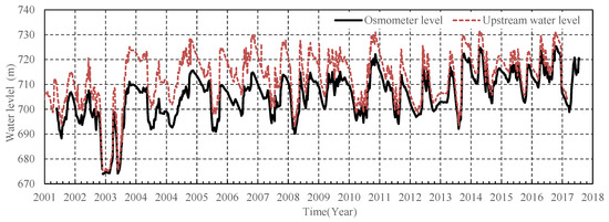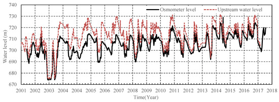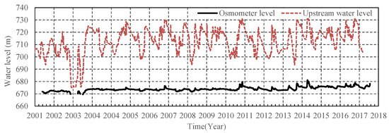 To elucidate the performance of the geomembrane, the B10 and B11 osmometer observation points are installed behind the geomembrane in the middle of the upstream face, and the B2 and B9 observation points are fixed at the bottom of the upstream face. The hydrographs of the osmometer level and upstream water level of B10 and B11 are shown in Figure 6 and Figure 7, respectively. From the monitoring start date, the osmometer level of these two points is very close to the upstream water level, and the water level difference remains within 0.5 m. Therefore, there is no hysteresis characteristic at B10 and B11, indicating that the seepage control effect of the geomembrane at B10 and B11 is weak. It is inferred that the local geomembrane at B10 and B11 has been destroyed, and some possible reasons for this inference are as follows: (1) Since the osmometer level is similar to the upstream water level from the monitoring start date, it is highly likely that the geomembrane near B10 and B11 was destroyed during the construction period. (2) According to the measured deformation data and calculation results from finite element method simulations, the central part of the upstream surface, where the two observation points are located, undergoes a relatively large deformation. The large deformation causes the local geomembrane to lose its strength and local cracking to occur under the resulting water pressure. The measured deformation data show that the cumulative deformations of the 3-4 and 4-4 observation points are 55 mm and 116 mm, respectively, after reinforcement. The 3-4 and 4-4 observation points are in the same cross section as B10, and the height difference between them is less than 7 m. Moreover, the 3-6 and 4-6 deformation observation points are in the same cross section as B11, and the height difference between them is less than 6 m. The cumulative deformations of 3-6 and 4-6 are 115 mm and 245 mm, respectively, and 4-6 has the maximum deformation after reinforcement throughout the dam. In addition, according to the results of the finite element method, the maximum value of the third principal stress of the geomembrane occurs in the central part of the upstream face, which is very close to the positions of B10 and B11. In summary, it can be determined that the local geomembrane at B10 and B11 has been destroyed.