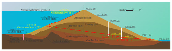 According to the osmometer observation points B11, B7, #1 and #2, the phreatic line in this blast-fill dam is inferred, as shown in Figure 12. The phreatic line in the blast-fill dam is slightly higher than that of the CFRD. In the dam body of CFRD, the seepage can be immediately drained due to a large gap in the rockfill area, so the phreatic line behind the impervious body is basically level with the downstream water level. The reasons why the phreatic line of the blast-fill dam is high are as follows: