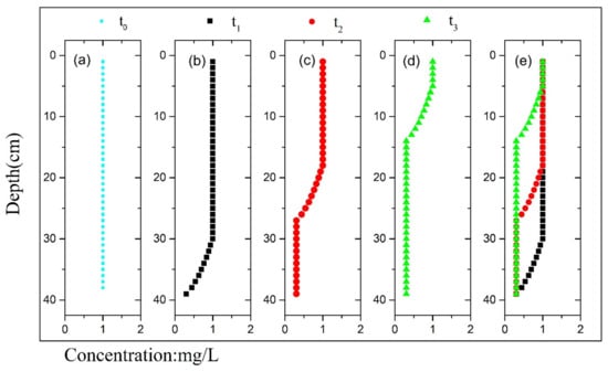 Theoretical concentration profiles of uniform injection at: (a) initial time ; (b) first observation time ; (c) second observation time ; (d) at third observation time . (e) the overlay chart of (b–d). Note that the time interval between two observation times is equal.