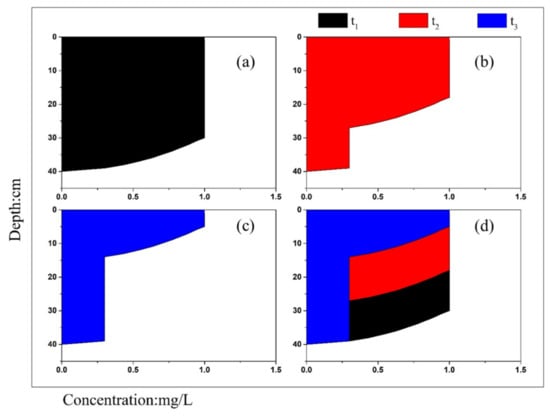 Illustration of the integral of concentration curve versus depth at: (a) first observation time ; (b) second observation time ; (c) third observation time (d) is the overlap of previous curves.