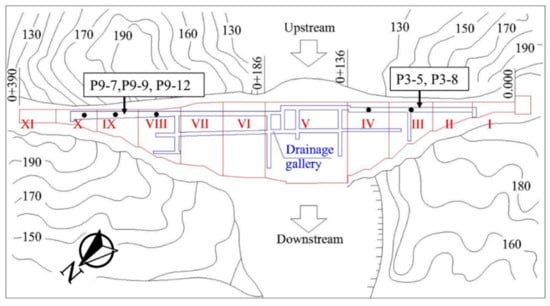 Top view of the dam. The black circles represent the boreholes where tracer tests were conducted. Locations of boreholes where SBDT was conducted are shown by two black circles which represent P9-7, P9-9, P9-12, and P3-5, P3-8, respectively.