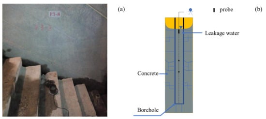 Geophysical methods such as electrical resistivity tomography, seismic tomography, and ground penetrating radar are commonly used for detecting and locating leakage zones in dams. For example, Ikard et al. [2] and Minsley et al. [3] used the resistivity method and self-potential tomography to investigate seepage in earth dams. Demanet and Jongmans [4] applied seismic tomography to locate the fracture zone while Di Prinzio et al. [5] and Xu et al., [6] used ground penetrating radar to detect voids in river embankments or dams. Al-Fares [7] used superficial electromagnetic, electrical sounding, and electrical resistivity tomography to characterize water leakage in dams. Similarly, Bièvre et al. [8] used electrical resistivity tomography (ERT) to characterize leakage. These approaches estimated the spatial heterogeneity in embankments based on contrasts of physical parameters of different media. Geophysical methods have the advantages of giving high resolution data and are non-destructive. However, these geophysical methods often need expensive equipment, expertise, and complex computation and interpretation algorithms. Moreover, these methods provide indirect evidence based on physical indices reflecting the permeability of earth materials or concrete rather than quantifying the seepage or groundwater flow. Therefore, it is difficult to accurately quantify leakage using geophysical methods.