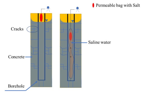 Before the injection, the amount of salt to be applied per borehole needs to be calculated to achieve a concentration higher than the background value. Once the salt is injected, the concentration increases above the original value to the expected concentration. Assuming that the concentration of saline water on borehole is uniform, the lower limit of consumed salt (mg) is calculated based on Equation (11):