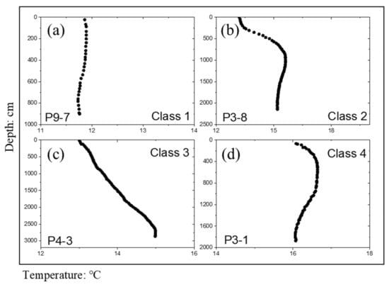 Representative temperature profiles of Classes 1, 2, 3, and 4 of the boreholes based on hydraulic behaviors. (a–d) represent the typical curves of Classes 1, 2, 3, and 4, respectively.