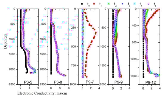 Overlapped EC profiles of boreholes P3-5, P3-8, P9-7, P9-9, and P9-12 at different times.