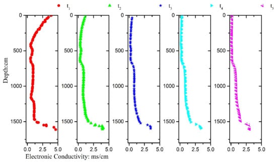 EC profiles of dam section IX (P9-7, P9-9, P9-12) show more obvious changes in EC, especially P9-7. The curve of EC for borehole P9-7 decreases to values below the detection limit at the second observation time , which means that the whole water column is replaced by fresh water. Similar to P3-8, the movement of vertical flow of P9-7 is longer than the length of the borehole between the first and second observations times. In other words, the vertical mean velocity of P9-7 is higher than 0.95 cm/s. The calculation is similar to P3-8, which is the extreme scenario of Equation (6). The EC profiles of boreholes P9-9 and P9-12 appear obvious, with differences that would be beneficial to analyze further. The EC curve of P9-9 is a typical case of upper vertical flow. For P9-12, the EC curve is a typical shape with high flow velocity, which can be found in a tracer-related study [20]. Figure 8 and Figure 9 show the breakthrough curves of P9-9 and P9-10 at different times. In these two boreholes, the time interval and EC curves are used to calculate the distance ranges of flow by Equation (6). Based on Equation (6), the mean velocity value of P9-9 and P9-12 are derived (Table 2). A detailed limit of distance for each test is provided in Table S3.