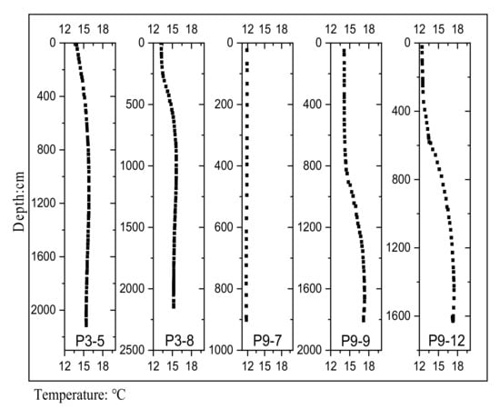 Class 2 has a weaker leakage phenomenon than Class 1. Some parts of the temperature profile were higher than 14 °C (the maximum temperature of the reservoir water), but the abrupt or inflection point with obvious fluctuation is evident. The points with low temperature in Class 2 can be used to locate the leakage zone. In Figure 6b, the low temperature zone shows leakage water with high-speed flow into the borehole, and the leakage zone of P3-8 is located at about 250 cm depth. The fast leakage implies that the upper half water in the borehole has limited interaction with the surrounding rocks. However, the rest of the water column in borehole strongly interacts with the surrounding rocks. The leakage zones of Class 2 are summarized in Table S1.