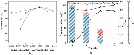 The verified experiment was performed under optimized conditions in triplicate, and the concentrations of ammonium, nitrite, and nitrate, as well as the OD600 and pH, are shown in Figure 5b. With the sharp decrease in ammonium and the appearance of nitrate, P. aeruginosa LS82 multiplied rapidly with a larger growth rate (0.427 h−1) and reached the stationary phase within 12 h. Subsequently, the denitrification process resulted in an increase in pH and TN removal efficiency within 18 h, reaching 99.8% ± 0.9%. The experimental values matched the predicted values within the margin of error, indicating that the built model could satisfactorily describe the relationship between the factors and response.