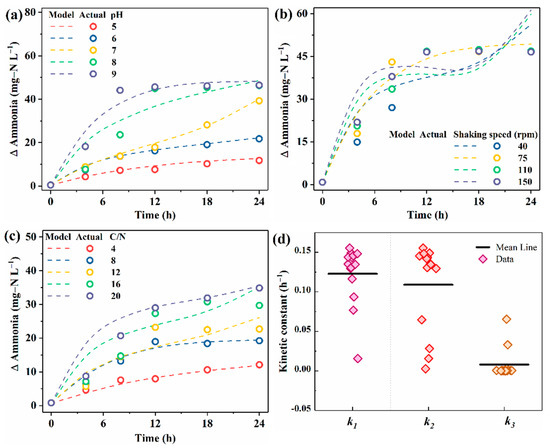 The kinetics of strain growth and nitrogen removal under all experimental conditions are shown in Table 1. The kinetic model was evaluated by t-test and Pearson’s correlation. The predicted results and actual values under various conditions are shown in Figure 6a–c. Pearson’s correlation coefficients under all conditions were in the range of 0.8–1.0, indicating that the predicted values of the model were strongly correlated with the actual values.