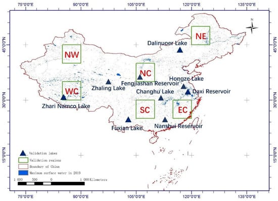 Meanwhile, the uniformity of the spatial distribution of these validation areas should also be considered. Finally, six 5° × 5° validation regions, located in the Northeast (NE), North (NC), West (WC), Northwest (NW), South (SC), and East (EC) of China were selected (Figure 3). There may be no data in a validation area in some months, which a neighboring area will replace. In each validation region, 2000 validation sample points were collected each month, including 1000 water samples and 1000 non-water samples. The validation samples and the training samples were not duplicated. Finally, a total of 144,000 validation sample points were collected in 2019.