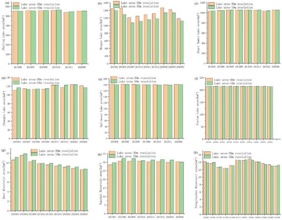 Comparison of two spatial resolution lake areas of large lakes (a–c), medium lakes (d–f), small lakes (g–k).
