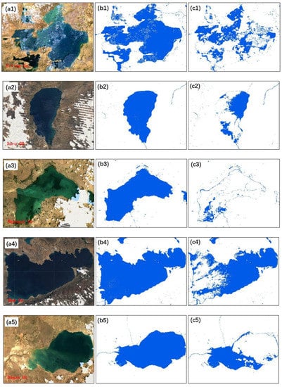 Comparison of water extraction results from TOA image and SR image (a1–a5 are Landsat 7/8 images, b1–b5 are water extraction results from TOA images, and c1–c5 are water extraction results from SR images).