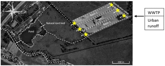 During dry weather, the SF-CW is receiving treated wastewater from the Grand Reims WWTP (activated sludge process with a capacity of 470,000 equivalent inhabitants) via the distribution canal. During rain episodes, the SF-CW is only fed by urban runoff. During the study, the theoretical hydraulic residence time of each basin varied from 4 to 7 days. The average flow was 150 m3·h−1 (8% of the total WWTP effluent flow rate) and was reasonably constant (CV = 19%) throughout the study. The water temperature was measured at the exit of the three basins using autonomous probes (CTD-diver, SDEC, Reignac-sur-Indre, France), with a sampling period of 15 min.
