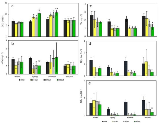 Variations in (a) DOC, (b) o-Ps, (c) TN, (d) ammonium and (e) nitrates according to the seasons for the inlet and the three outlets (B1out, B2out and B3out). * indicates a significant difference (Student’s t-test) between the seasons (* p < 0.05, ** p < 0.01). The sample size (n) varies seasonally for the inlet (winter: n (8); spring: n (11); summer: n (22); autumn: n (17)) and outlets (winter: n (3); spring: n (4); summer: (8); autumn: n (7)).
