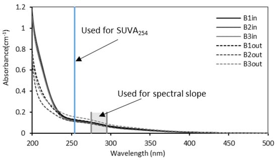The UV-visible spectra provide information on the characteristics of DOM in the basins after calculating the S275–295, E2/E3 and SUVA254 indices. An example is provided in Figure 4.