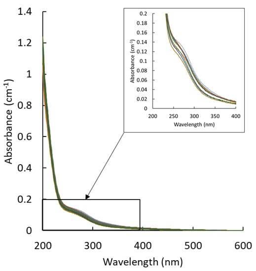 The synchronous fluorescence spectra were collected on a Hitachi F-2500 (Krefeld, Germany) fluorimeter. The excitation wavelength range was 230–600 nm with a constant offset (Δλ = 50 nm) between the excitation and emission wavelengths using a 1 cm path-length quartz cell. The scanning speed was 300 nm·min−1, the wavelength increment was 1 nm, and the slit widths were set to 2.5 nm. The spectra were corrected for Raman scattering by measuring the Raman peak of ultrapure water (excitation wavelength = 350 nm, emission wavelength range 380 to 410 nm) [45]: