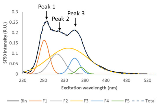 Three fluorescence peaks were observed in the synchronous fluorescence spectrum of B1in (Figure 6). Peak 1 (max approximately at λex = 270–290 nm) is associated with protein-like substances [49,50,51,52,53,54,55,56,57,58,59,60,61,62,63,64,65,66,67,68,69,70,71,72,73,74,75,76,77,78,79,80]. Peak 2 (max approximately λex = 320 nm) and peak 3 (max approximately λex = 350–360 nm) are attributed to humic-like substances [79,80]. These peaks can be further associated to five fluorophores, as determined by spectral deconvolution. Their characteristic wavelengths (bi) are 280 nm (F1), 310 nm (F2), 340 nm (F3), 355 nm (F4) and 370 nm (F5). F1 is associated to protein-like substances, and F2 to F5 to humic-like substances. F3 fluorescence contributes to the whole wavelength range and has an influence on peak 1 fluorescence.