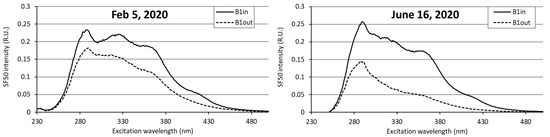 Synchronous fluorescence spectra in winter (5 February 2020) and summer (16 June 2020) at the inlet and outlet of B1.