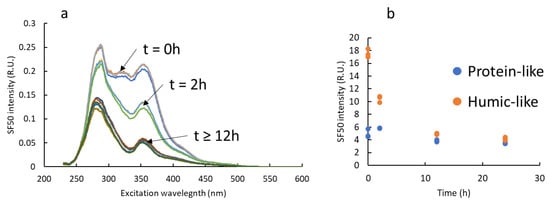 As photodegradation is a major process that can modify the characteristics of DOM [57,81,82,83,84,85,86,87], the evolution of the synchronous fluorescence intensities of the protein-like substances, represented by F1 and of the humic-like substances (represented by the sum of the intensities of F2 to F5) were plotted as a function of time for the photolysis experiment A, run with a UV-A lamp (Figure 8b). Protein-like substances are less sensitive to photolysis than humic-like substances, as their fluorescence decreased by 30% during the experiment, against 76% for the fluorescence related to humic-like substances.