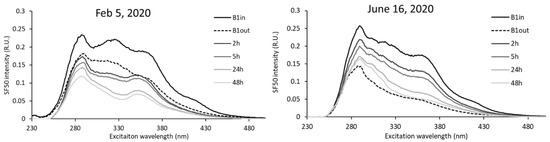 In order to be more realistic concerning the irradiation conditions, experiments B and C were run with a solar lamp for 48 h (Figure 9). Under these conditions, the synchronous fluorescence spectrum collected at the end of experiment C was close to the spectrum collected at the exit of B1 in June 2020. For the winter sample, the photolysis effect observed in the lab was stronger than the one observed on the field.