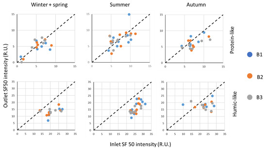 Figure 10 compares the SF50 intensities related to protein-like and to humic-like substances for the three basins according to the season (n = 21). The lowest protein-like fluorescence intensities were recorded in winter and spring, but globally there was no drastic change between inlet and outlet. The humic-like fluorescence intensities at the outlet were always lower than those at the inlet, whatever the season. This is in agreement with the findings of Mostafa et al. [56], Hur et al. [81] and Clark et al. [85] who have shown that the decrease in fluorescence intensity of humic-like compounds is more important than that of protein-like compounds after a period of photolysis.