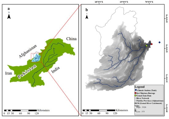 The Gomal River originates from the mountains of Paktika province of Afghanistan and is about four hundred kilometers in length. The Gomal River catchment area at Kot Murtaza Barrage is about 36,000 km2; about 70% of the area lies within Pakistan, and 30% in Afghanistan. The elevation for the catchment ranges from 375–3320 m above the mean sea level. The average flow of Gomal River is about 0.974 Gm3 year–1 (4.1%). According to Tank weather station data for the period 2003 to 2009, the catchment area of Gomal River receives an annual rainfall of 301 mm and minimum-maximum temperature ranges from −6 °C to 49.4 °C, respectively. The physical infrastructures in the Gomal River catchment on the Pakistan side are: (1) a storage dam with two powerhouses having a total power generation of about 91 GWh, (2) a diversion barrage, and (3) a canal irrigation system to irrigate more than 77 thousand ha of agricultural land to irrigate D.I Khan and Tank districts. A multipurpose Gomal Zam Dam was constructed on Gomal River in South Waziristan, KPK and a barrage at a 40 km downstream dam site near Kot Murtaza village.