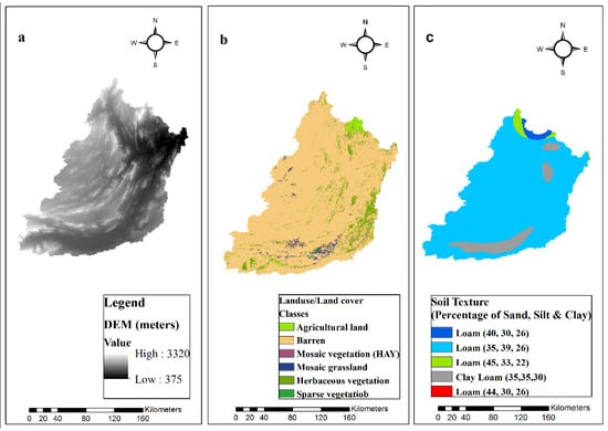 Spatial data inputs: (a) DEM, (b) land use land cover, (c) soil texture classes (percentages of silt sand and clay are given in parentheses).