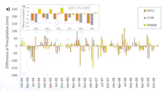 A graph of the differences between the selected precipitation datasets (i.e., TRMM, GPCC and CFSR) and the gauge data is shown in Figure 3. The TRMM data show the best agreement among all the gridded precipitation datasets used for the study on a monthly basis, and the values of MBE, MAE, and IA were calculated as 0.35, 18.36 and 0.80, respectively. On an annual basis, TRMM and CFSR underestimated the precipitation throughout the study period. However, estimates of TRMM precipitation improved after 2006. Overall, TRMM precipitation was overestimated by about 1%, whereas the GPCC and CFSR presented 13 and 15% underestimations of precipitation, respectively, when compared with the observed data of the precipitation gauge for the study period. These results corroborate the previous findings for catchments in other regions of the world [44,45].