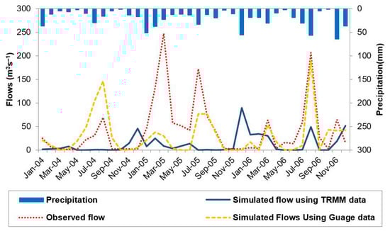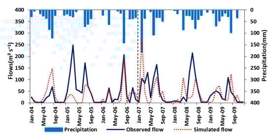 During the validation period (2007–2009), the values of R2, NSE and PBIAS were 0.08, −0.25 and 42.4, respectively, which indicated the poor performance of the model during the validation period. Moreover, the negative value of NSE indicates that the mean observed flows are more efficient than the simulated flows. Figure 5 shows that the model responds to individual rainfall events reasonably, but in July 2008 and 2009, the simulated flow was much lower than the observed one; however, rainfall during that particular month was 93 and 58 mm, respectively.