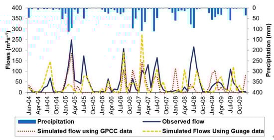 The precipitation gauge is located in a plain several kilometers from the Gomal catchment stream gauging site, i.e., near Kot Murtaza, as opposed to the hilly terrain of the catchment from which the runoff originates. Therefore, runoff was not accurately estimated, as indicated by the low values of the performance indicators (see Section 3.2.1). Moreover, the single value for precipitation gauge data is not representative for such a large catchment due to the spatial distribution nature of the precipitation. Therefore, considering these limitations, three gridded precipitation datasets (i.e., GPCC, CFSR and TRMM) were used to assess the runoff from the Gomal River catchment. As discussed in the previous section, runoff from the catchment was simulated on a monthly basis. The simulated runoff during the calibration and validation period using the GPCC gridded dataset is shown in Figure 5.