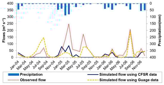 Simulated and observed hydrograph on monthly basis using precipitation gauge data for the calibration (2004–2006) and validation (2007–2009) periods.