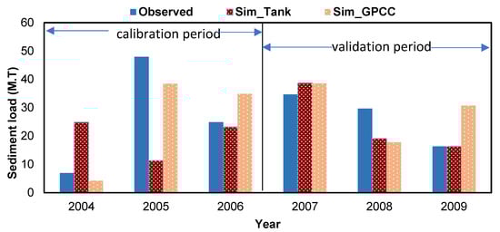 The precipitation gauge data at the Tank station and the GPCC gridded datasets provided comparatively better runoff estimations. Therefore, the same datasets were used for the calibration and validation of the SWAT model for sediment yield estimations. Sediment yield was estimated on an annual basis at the Kot Murtaza barrage site. The model was calibrated and validated for sediment yield for the periods 2004–2006 and 2007–2009, respectively (Figure 8).