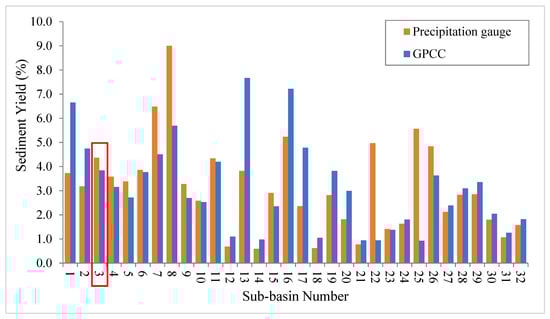 Sediment yield simulations at the sub-basin level using the observed and GPCC precipitation datasets show a good agreement when excluding a few sub-basins (i.e., 7, 8, 13, 22, and 25), which make up 23% of the total area (Figure 11). Therefore, there is great potential for the use of GPCC precipitation data in ungauged or data-scarce regions.