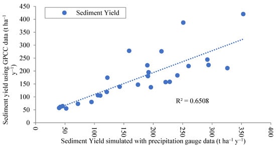Relationship between sediment yields simulated with observed and GPCC precipitation datasets.