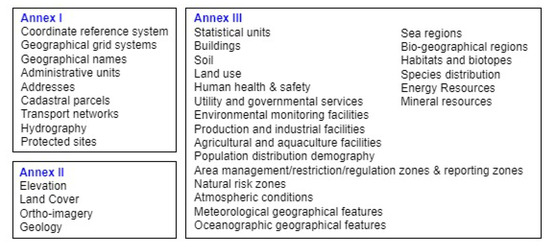 INSPIRE data themes, organized in three annexes. Source: INSPIRE directive (2007/2/EC) [5].